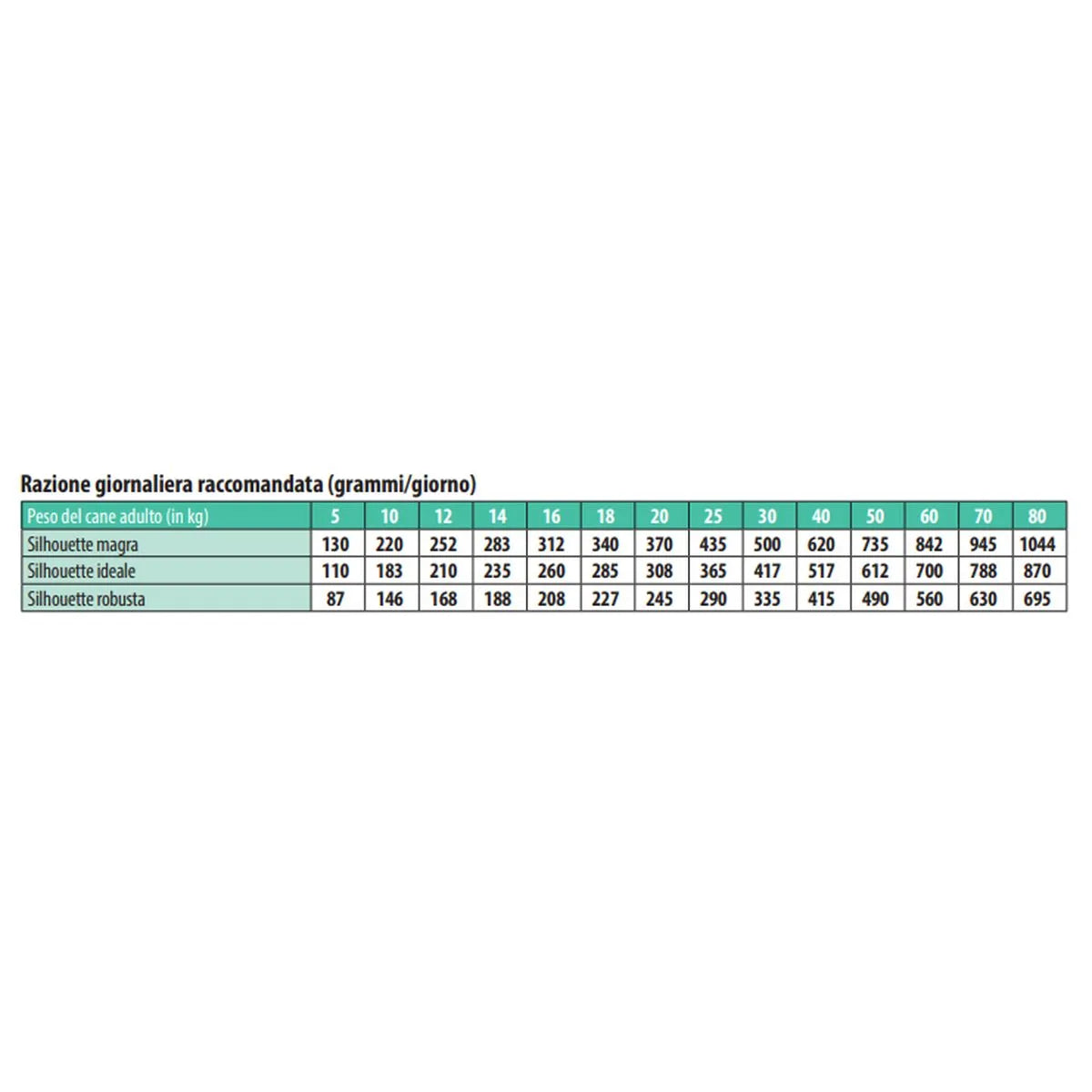 Adattare la quantità in base al peso, al livello di attività e alle condizioni fisiche del cane.