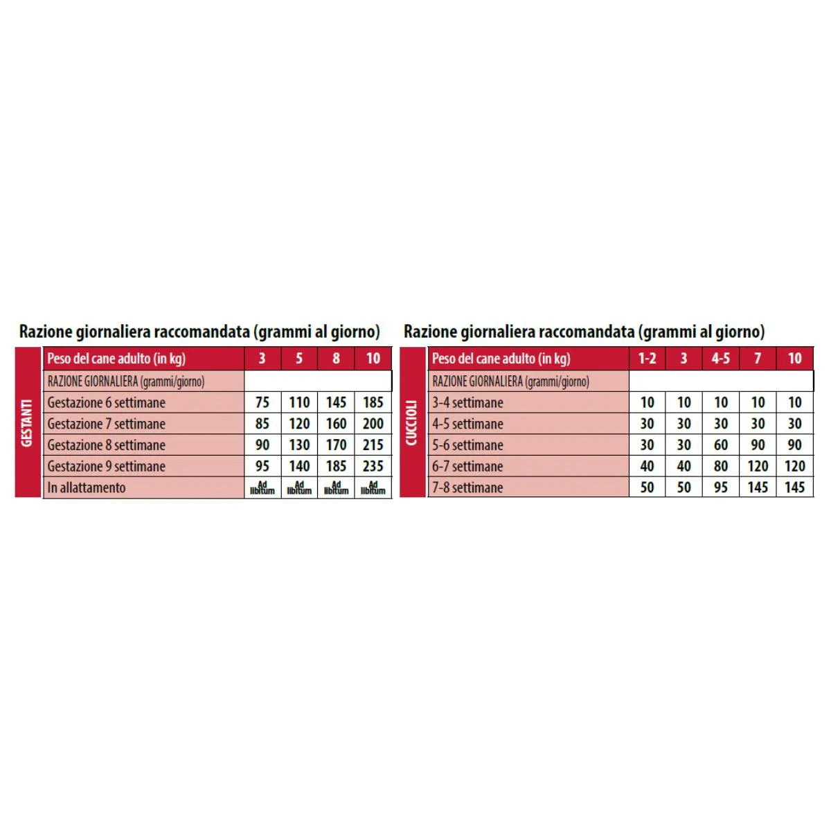 Per le cagne in gravidanza e allattamento, aumentare la dose in base al fabbisogno energetico.
